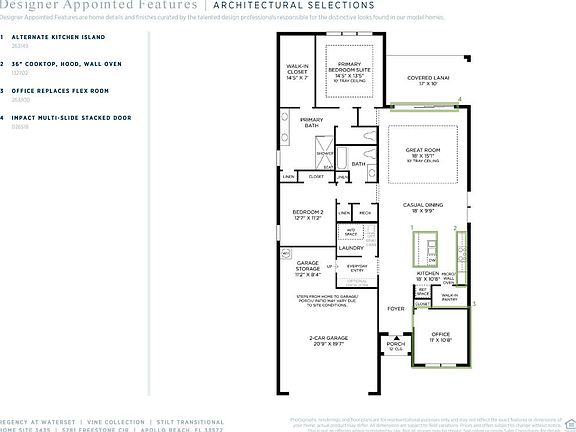 Discover effortless living in this beautifully designed two-bedroom, two-bath home with a dedicated office and two-car garage, offering 1,916 square feet of thoughtfully planned space. This home blends comfort, function, and serene views. Enjoy tranquil water views from the covered lanai, perfect for relaxing or entertaining. Inside, you'll find abundant storage, from the roomy garage to the generous closet space throughout. The primary suite features an oversized bathroom and a large walk-in closet, creating a peaceful retreat for rest and organization. Disclaimer: Photos are images only and should not be relied upon to confirm applicable features.