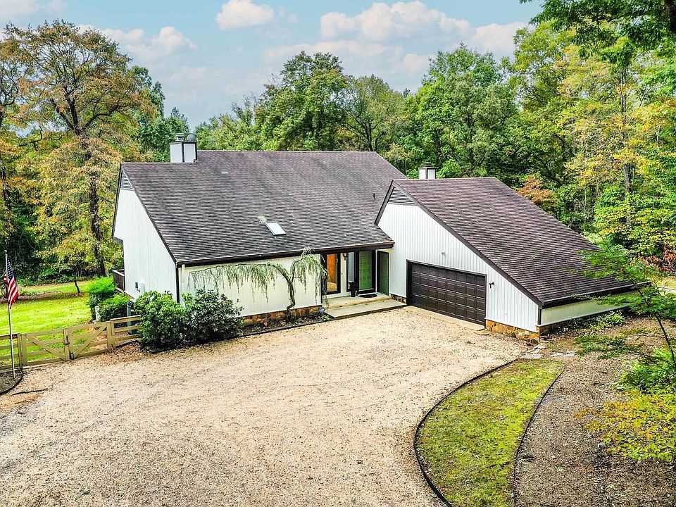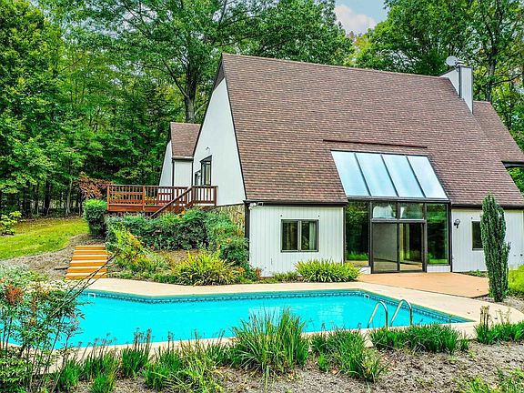 This unique, contemporary home near Crozet is a hidden gem on 8+ secluded acres. As you enter, an open two-story atrium floods the space with sunlight and provides passive solar heating. The main level features an open concept floor plan perfect for entertaining. A breakfast nook with new light fixture, and wood-burning fireplace with stunning wood trim adjoins the kitchen. The main level primary suite offers a large walk-in closet and an ensuite bathroom with a walk-in shower and soaking tub. Downstairs, a rec room with floor-to-ceiling windows provides ample natural light, and a flexible space that could be a craft room, workout space, or future kitchen (pre-plumbed) offers expansion options. Two bedrooms, each with private ensuite bathrooms, complete the lower level. Outside, an inviting in-ground pool (liner replaced 2021) and terrazzo tile patio are surrounded by lush landscaping designed by a Master Gardener. Enjoy outdoor living on the large side deck or the primary bedroom's private balcony. Additional amenities include an oversized attached garage, Generac generator, and split rail fencing. With easy access to trails and wine country, this freshly painted (ext 2024) home is a must-see!