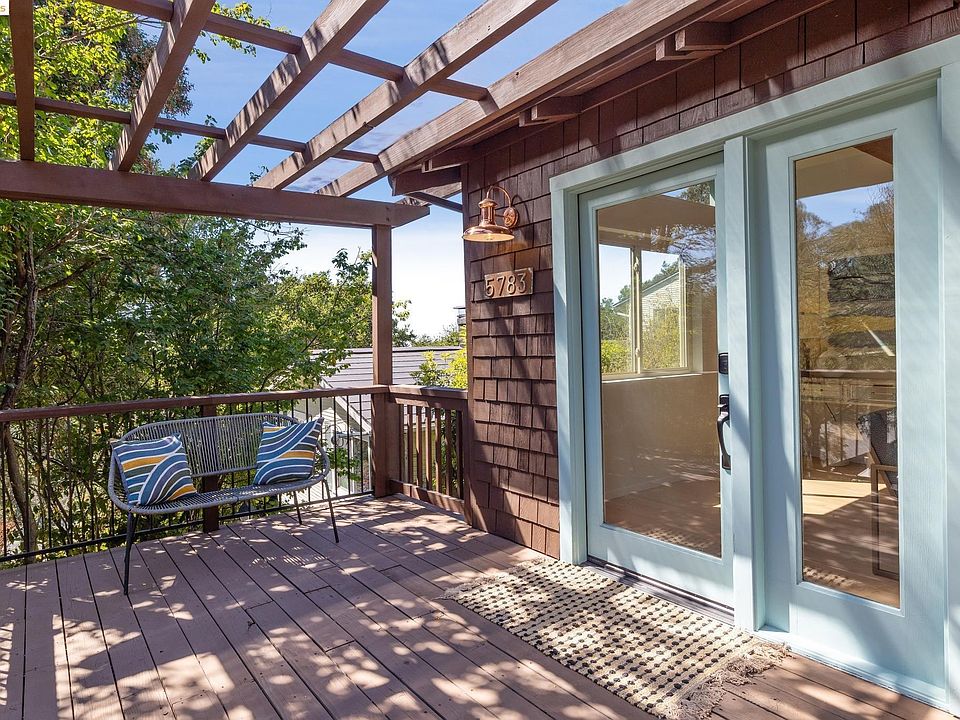 5783 Florence Ter is a stunningly renovated 2-bed, 2-bath home in the Montclair Hills, just moments from Thornhill Shops and downtown Montclair. Through the front door from the elevated front deck, the living room awaits with a striking fireplace at its center. Vaulted ceilings, exposed wood beams, and skylights highlight the space. Enjoy the true office through the french doors. The heart of the home is the impeccably updated eat-in kitchen, boasting brass fixtures, subway tile backsplash, gleaming quartz countertops, and brand-new GE appliances. Down the hall, adjacent to the laundry nook, the main bath exudes luxury with patterned floor tile, and glass-enclosed shower featuring marble floor tile and floor-to-ceiling subway tile. Vaulted wood plank ceilings mark the bedrooms, while the sizeable rear primary offers a large walk-in closet and a versatile loft area. The rear deck, perfect for dining alfresco and hosting guests, offers seamless indoor-outdoor flow from both the kitchen and primary. The substantial backyard is a blank canvas, and a second back deck provides a sunny spot for relaxation. Below the main home is extra space ideal for guests or in-laws. Lastly, the home is completed by owned solar on the roof and two basement storage areas. Close to Highways 13 & 24.