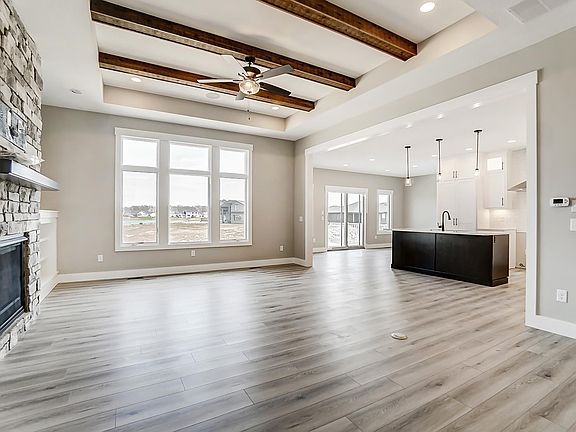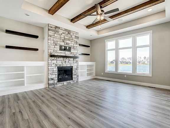 Carriage Place Homes presents an open, split bedroom ranch on a daylight basement overlooking a beautiful 5 acre pond. You will be wowed the minute you walk inside and greeted by quality construction and many features including: vinyl plank flooring, 10' ceilings & cased openings, wood beamed ceiling in Great Room, 3 panel Masonite doors, surround sound w/ built in speakers, plus much more. In the kitchen you will find Quartz countertops, tile backsplash, white custom kitchen cabinets w/ black island, and a hidden, walk-in butler pantry. The dishwasher, microwave, and range are included in the sale price. The nook opens onto the 14x12 trex deck. The large master, en-suite bedroom has a bathroom with custom cabinets, quartz countertop, walk-in tile shower, and a huge two-story master closet. Large den w/ walk-in closet. There is also separate laundry room w/ utility sink, half bath, & bench seat area. Large 3-car garage gives you room for storage. The basement is plumbed for wet bar and a full bath.