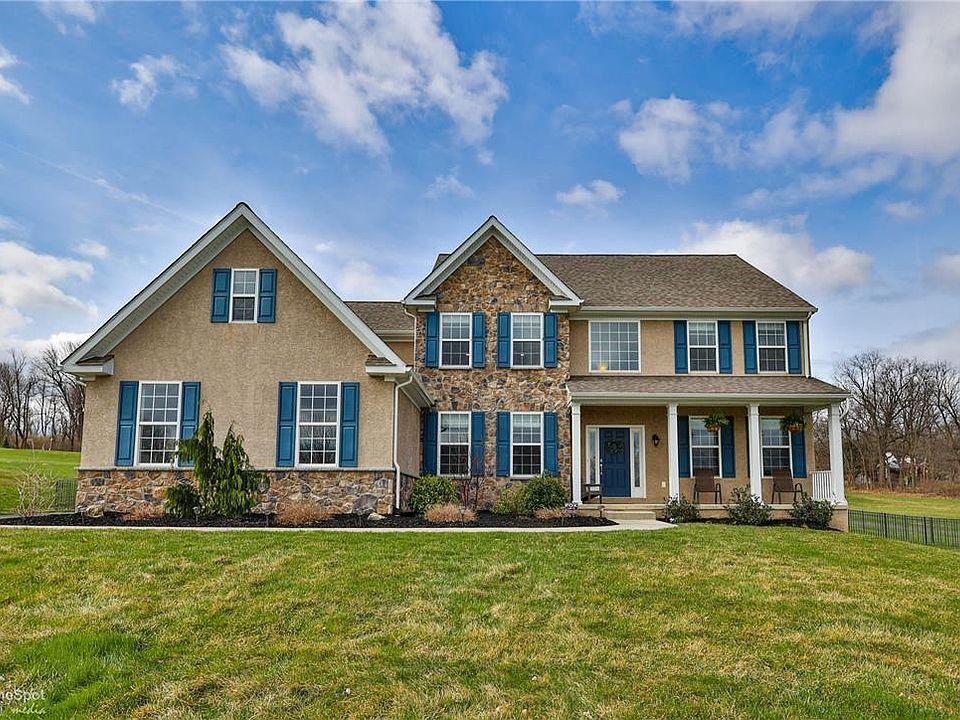 Enjoy the covered front porch with sweeping vistas of farms and South Mountain at this former model home. The entranceway greets you w/double height ceilings & elegant staircase. 1st floor features hardwood floors, traditional layout, vaulted and 2 story ceilings, great room ,office, living room with gas fireplace and dining rm. The modern gourmet kitchen features upgraded cabinetry, gas cooking, granite counters, large island, and pantry. Great home for entertaining with open floorplan and plenty of natural light. Patio doors lead out to the composite deck. The 1st floor includes a mud room and laundry. The 2nd fl features 4 large bedrooms: The master suite offers a walk in closet, sitting area, luxury tiled bathroom, double vanity, soaking tub & oversized shower. The basement offers high ceilings and is ready to be finished. The large flat lot is fenced in the rear, professionally landscaped & well manicured. Emmaus School District. Listing agent is related to seller.
