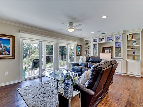 55+ community!! 2BD/2BA "Casa Linda" floorplan with AMAZING view of Aliso Creek + GORGEOUS remodel by one of LW's most regarded contractors!! This property does not disappoint - you'll love it!! No steps, no one above & close carport. Upon entry, you'll be "wowed" by the beautiful view and the comfortable elegance throughout featuring dual pane windows, central heat/ac, vinyl flooring, paneled interior doors, upgraded crown/base moldings, ceiling fans, plantation shutters, surround sound and recessed lights. The living room area enjoys two display/storage built-ins and remote control shades on dual sliders leading out the south facing balcony. Covered balcony has roll down sun shades for those warmer days. Living room opens into the dining area with custom trey ceiling and mirrored wall to reflect the view! Open kitchen is outfitted with warm wood Kraftmaid cabinets & soft close drawers/doors, pull out trash/recycle bins, pull out shelves, lazy susan and lighted display cabinets. Stone counters and glass tile backsplash including feature wall over the sink, stainless appliances, huge skylight and pendant lights complement the beautiful space. Multi-purpose guest/office area has built-in desk and hutch, storage sideboard, full size Murphy bed, mirrored closet doors and balcony access. Guest bathroom features walk-in bath tub and large skylight. Spacious master suite houses an enlarged tile shower with seat and dual shower heads plus a full size washer/dryer. A must see!