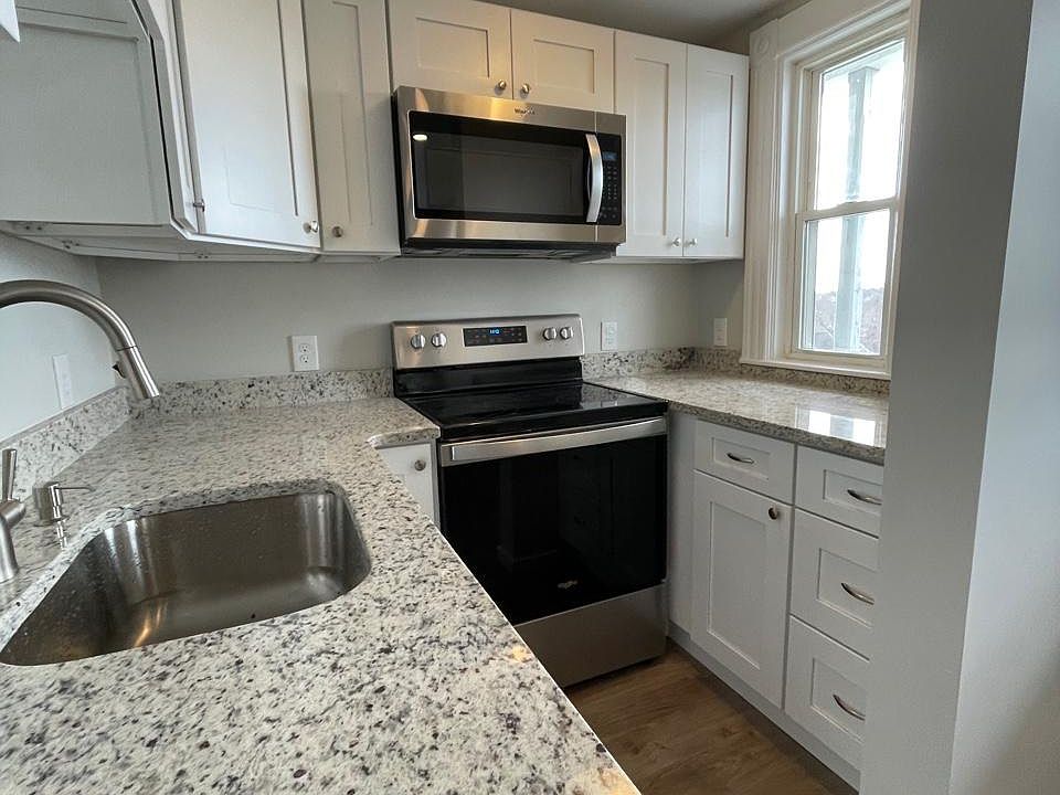 Newly renovated third floor apartment, 3 Bedroom 1 Bath. Renovations include a new kitchen with shaker cabinets, granite counters, dishwasher and brand new appliances. A new bath with tiled shower. Electrical has been completely redone. The heating has been upgraded to a modern forced hot water gas boiler. Apt includes 2 off-street parking spots, coin-op Laundry room in the building, also includes a storage room. Tenant is responsible for gas and electric. Cats ok with a pet rent of $50/cat, dogs a strict no. First months rent and security deposit due at lease signing. This apartment does not accept section 8. Smokers need not apply. Applicants need to pass a background and credit check. No subletting. Email to set up a showing. Tenants pay for gas and electric. Dogs are NOT allowed, cats okay. Strict no smoking policy.