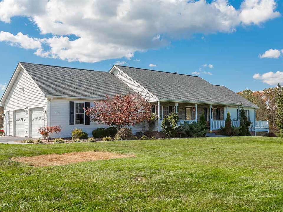 Lovely ranch home with a two car attached garage, sunroom, den and 2 bathrooms. Need a third bathroom? It's already roughed in! Updated kitchen, flooring, Brand New Trane HVAC, water softener, roof, painting and more. Enjoy the large master bedroom with a private deck, walk in closet and spacious bath. Fiber Optic just installed. Outside there is a paved driveway, hot tub, greenhouse, huge 2 stall horse barn, and a beautiful pond. 9.7 acres of level land with lots of privacy. Additional land is available! See MLS 610091