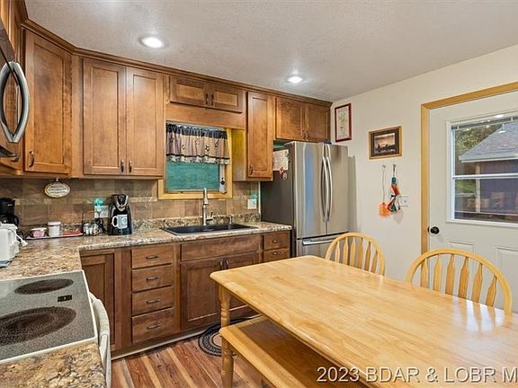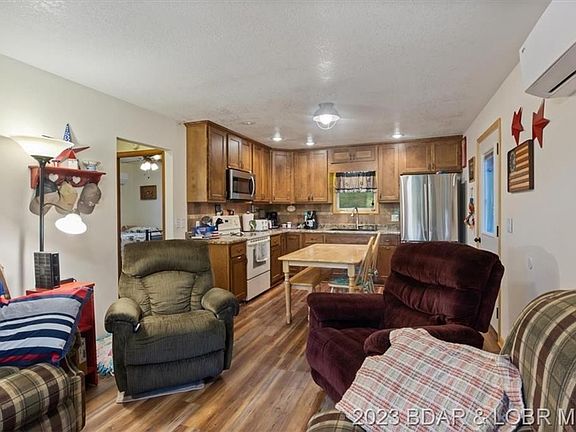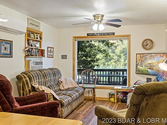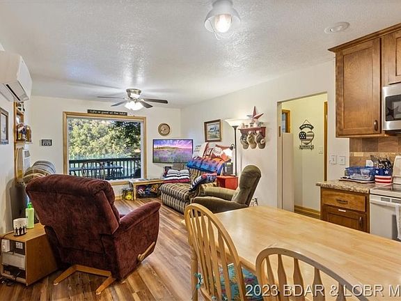 Adorable Lakefront Cabin with a FLAT yard! Enjoy the calmer water on the 60 MM in Rainey Creek Cove that is perfect for fishing, swimming, water sports, boating, etc! Tons of outdoor entertainment area with a fire pit right by the water and deck space off of the house. The open concept layout and big lakeside windows make the home feel much larger than the sqft count and the kitchen was remodeled in 2018 with new cabinets, backsplash, and counters! The detached garage is 16x26, built in 2012, and has electric + water. Great storage area and currently has a washer, dryer, and additional fridges/freezers plus there is even more storage under the home in the crawlspace! Start enjoying lake life right away as it is selling furnished and turnkey! Perfect retirement, family, or rental lake house. Boat ramps nearby, gas dock + restaurant across the main channel, and no HOA! Only 2 hrs from KC and 3 hrs from STL. 2023-04-10