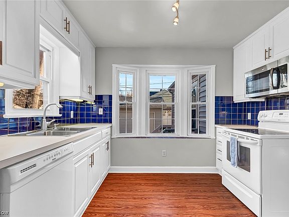 Prepare to be Moved! This lovely Colonial home at 579 Oakmoor Road in Bay Village is a must-see! Tucked away on a quiet street, this home offers plenty of space for the whole family. As you enter, you’ll be drawn to the stunning bamboo floors that span the main level, complete with neutral colors that will fit any decor. The cozy gas fireplace with built-in bookcases in the family room creates a warm and inviting atmosphere. The living room and dining room feature cove ceilings with built-in corner china cabinets in the dining room, and the half bath on the main floor even has a pocket door for added convenience. The crisp and clean white kitchen is complemented with a cobalt blue tile backsplash. Upstairs, you’ll find three spacious bedrooms with hardwood floors and