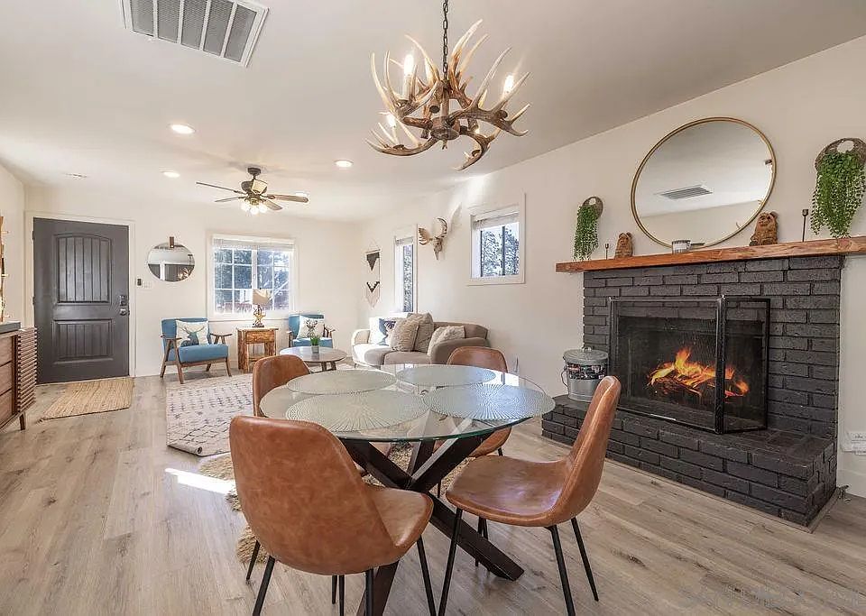 Your Year-Round Mountain Getaway Awaits – Ideal for both summer and winter adventures. This charming 2-bedroom, 2-bath cabin is tucked away in a quiet neighborhood near the lake and village, offering the perfect balance of relaxation and convenience. Upstairs, enjoy an open-concept living space with a cozy brick fireplace, an upgraded kitchen, and a master suite with private bath. The lower level functions as a granny-suite-style retreat with a second bedroom, full bath, and laundry—great for guests or extended stays. Step outside to unwind in the newer spa tub (under 2 years old) or gather around the backyard fire pit for s’mores and stargazing. Indoors, stream your favorite shows or enjoy a board game by the fire. Whether it’s hiking and biking in summer or skiing and snowboarding in winter, Snow Summit is just minutes away. Along the route, you’ll find local cafés, breakfast spots, and equipment rentals, with grocery stores and resort dining close at hand for added convenience.