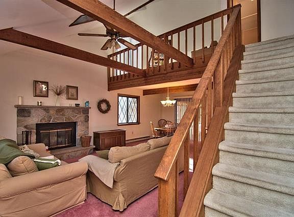 FULL TIME? VACATION HOME? You decide with this well maintained and deceivingly spacious 3BD/2BTH Contemporary with finished basement and 1 car garage situated on 1.03 wooded acres in Birch Hollow Estates in Pleasant Valley school district! Enjoy an open floorplan with cathedral ceiling, exposed beams & skylights, lots of natural light & storage throughout. The living room boasts a wood fireplace with stone surround, the kitchen is well-appointed & has a double sided breakfast bar. Each bedroom is spacious with a first floor Master with adjacent bath & laundry area, and 2nd floor loft with slider to a private balcony with views. The front deck & attached screen porch are perfect for relaxing or entertaining. Low maintenance house & yard, low taxes & dues! Walk to community amenities & minutes to major roads & area attractions! CHECK OUT OUR VIRTUAL TOUR! Call today!