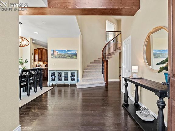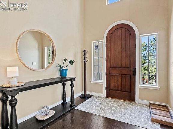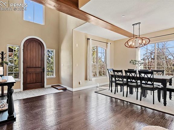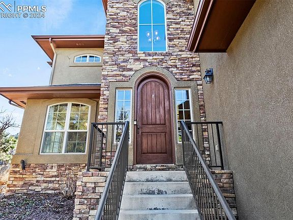 Discover unparalleled mountain luxury with this exceptional 6-bedroom, 5-bathroom, 3-car garage home, a fusion of stucco, stone, and wood that redefines elegance in Colorado Springs' prestigious Spires at Broadmoor. Spanning 5,200 sq ft on a lush, half-acre forested lot, this property offers modern mountain living at its finest. The entrance welcomes you with an impressive arch-shaped door, leading into a foyer with a castle-like ambiance. The main level features a formal dining area and a chef's dream kitchen with a center island, vegetable sink, knotty Alder Pine cabinets, and granite countertops, complemented by an 8x8 walk-in pantry. The cathedral-style living room, with its stone fireplace and floor-to-ceiling windows, provides a cozy yet elegant space for gatherings. The primary suite on the upper level is a private retreat with coffered ceilings, a 5-piece bathroom, and a spacious walk-in closet, opening onto a deck with Cheyenne Mountain views. Three additional bedrooms offer family-friendly living, with two sharing a Jack & Jill bathroom and one with a private bath. The lower level is designed for entertainment, featuring a walk-out, theater room, and wet bar with a wine cooler. Two additional bedrooms offer guest privacy. Equipped with a whole house fire sprinkler system, two AC units, a radon mitigation system, and built-in surround sound speakers, this home combines safety with luxury. Engineered wood flooring and stylish finishes throughout underscore its class and elegance. Experience the pinnacle of mountain-style living in a home that blends luxury with the tranquility of nature in one of Colorado Springs' most sought-after communities.