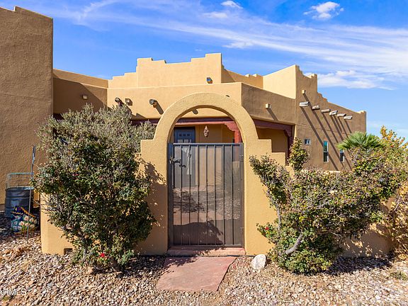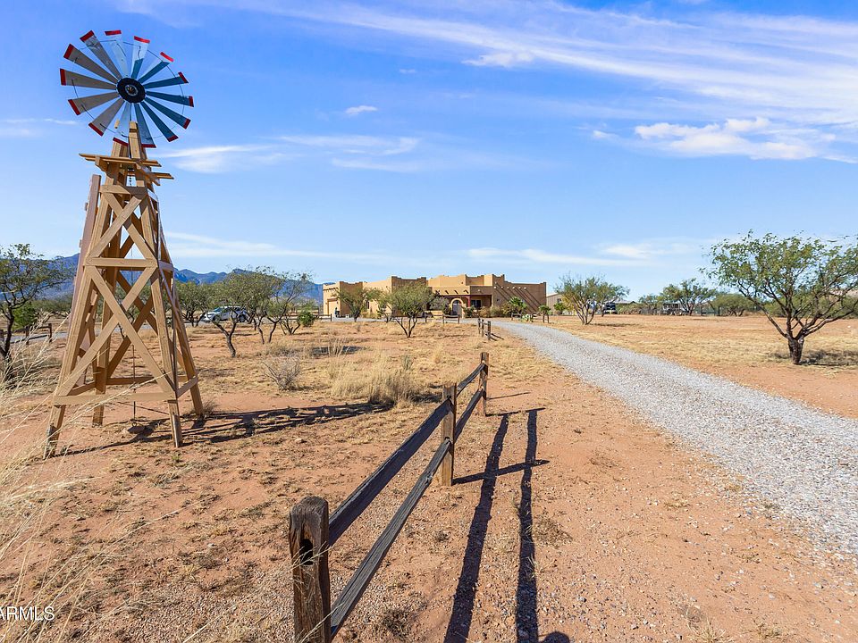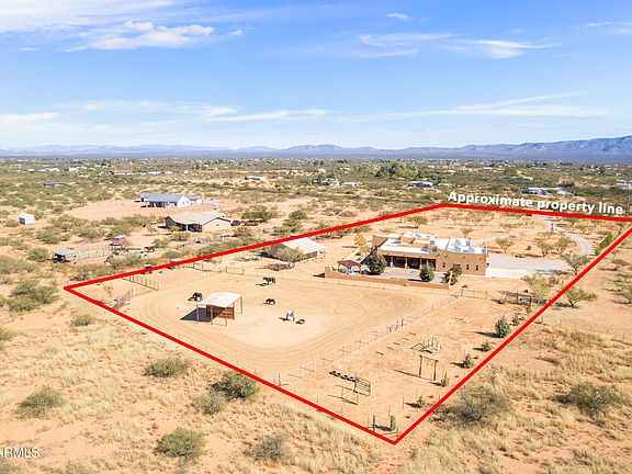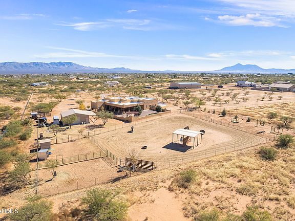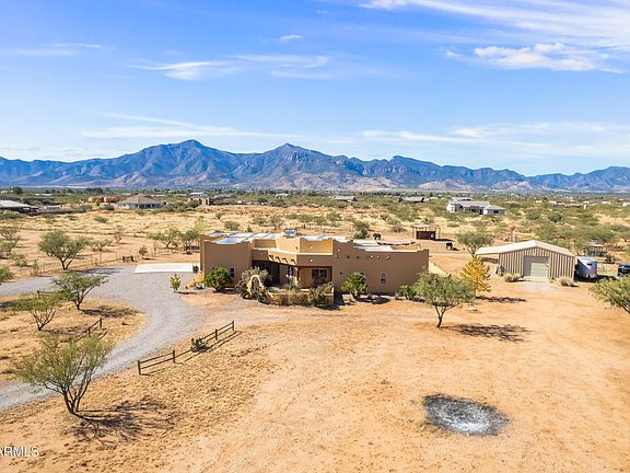 WOW!!!! This house is AMAZING!!! What an opportunity to own a custom Sante Fe Home built out of Rammed Earth on 4 Acres fully fenced and cross fenced for your horses/animals, your own PRIVATE WELL, site built pole barn with electric, huge outdoor kitchen with hickory cabinets and granite, 10-12 foot ceilings, pellet stove, bar, colored concrete floors, granite throughout, tankless water heater, 20 solar panels that are owned, huge covered patio with beautiful views of the Huachuca Mountains and the Mule Mountains from the front courtyard, pergola with custom Kiva fireplace, coyote proof chicken coop, garden/raised beds, fire safe property, horse corrals, wash rack, round pen and so much more!! ASK YOUR REALTOR FOR ''SELLER FEATURE SHEET'' and that will show you everything and more!!