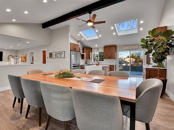Completely reimagined and freshly remodeled, is perfect for move-in ready, low-maintenance modern living. Soaring vaulted ceilings and an expansive open floor plan that feels light, airy, and effortlessly chic. Brand-new luxury vinyl plank flooring flows throughout the main level, paired with all-new windows, skylights, designer lighting, and fresh exterior paint. The heart of the home is the stunning chef’s kitchen featuring medallion maple cabinetry, crisp white quartz countertops, and a dramatic waterfall quartz island. Entertaining flows seamlessly into the dining and living areas.