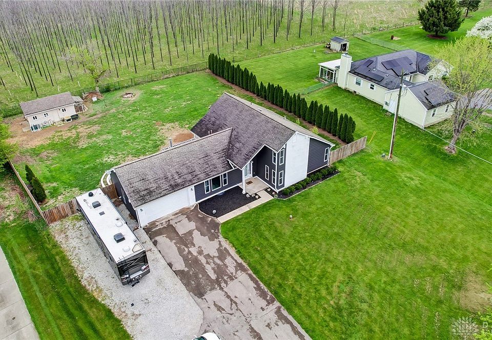 An amazing 4 bedroom and 2.5 bath home located in Clearcreek Township is now available for you to call yours! You will notice the care the homeowners have taken when you pull into the extra long driveway (plenty of parking for large get-togethers & a new RV pad) with the tidy landscaping, new exterior lighting and a fresh new look! This home boasts of an open concept floor plan - the spacious living room, with its newly refaced fireplace, is bright with tons of natural light flooding in from the large windows and two patio doors lining the back wall. The patio doors lead to a wonderful sized paver patio with a retractable awning ready for convenient indoor/outdoor entertaining. The kitchen, which was once closed up, has undergone extensive remodeling and now opens to the living room. The first floor primary suite is complete with a closet and laundry room for your convenience. (If needed, the primary closet/laundry room can easily be turned back into a bedroom. Washer/Dryer hookups were brought up from LL.) A tucked away home office finishes the main level. The main floor also includes new low maintenance flooring throughout for ease of daily living and clean up. The second floor has two generous bedrooms, each with new carpet, and a full bath. This home is perfect for pet lovers as it comes with a dog grooming station in its lower level along with a flex room that could potentially be a workout or playroom space. The backyard also includes a shed and chicken coop. This house has undergone several upgrades within the past four years which include: neutral paint or shiplap throughout interior, one sliding patio door, water heater, complete HVAC system, gutters, exterior siding, exterior paint, partial privacy fence, sump pump and battery back up, septic field sump pump, garage door springs. Lower level stairs have also been rebuilt. But the best part? This home is located in the Township, so you won't have to worry about city taxes, making it a dream home for anyone!