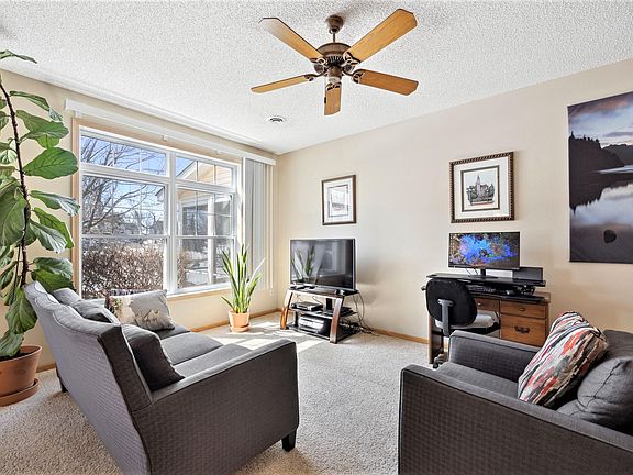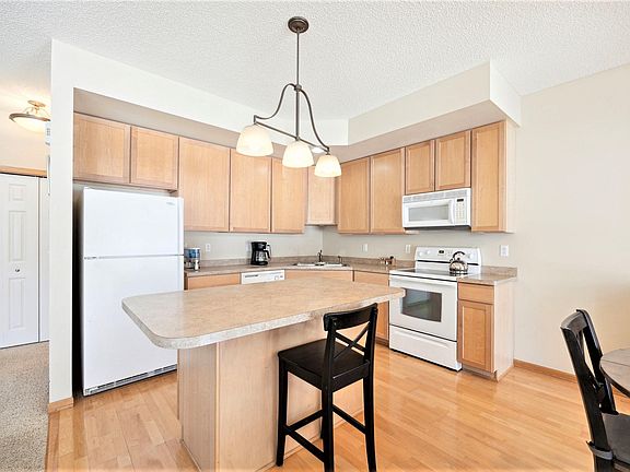 Carefree living at its finest! Demand “Village by the Bay” 2 story, 3-bedroom, 2-bathroom 2 car garage, southerly exposures pond view unit designed for comfort, style and function, featuring abundant sun filled open concept main level with center island breakfast bar space, beautiful maple flooring and upgraded maple kitchen cabinetry, dining area opens to spacious covered screened porch with notable, tranquil, private pond views perfect for relaxing entertaining moments! Convenient main level half bath, epoxy floored 2 car attached garage. Upper-level features 3 spacious bedrooms with neutral-colored walls and flooring, walk-thru bathroom, large primary bedroom walk-in closet, convenient full-sized washer and dryer closet, primary bedroom and second bedroom are south facing with an abundance of natural light, the 3rd bedroom is 20x19 could be family room or combination bedroom/family room with a full wall closet space. Prime location close to dining, Dakota Trail, services.