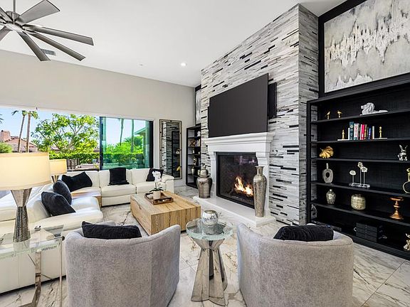 Welcome to your dream home at 57910 Stone Creek Trail West, nestled within the prestigious Stone Creek Ranch in La Quinta. This luxurious residence redefines elegance with its seamless blend of indoor comfort and outdoor grandeur, set on a premium lot that captures sweeping views, sunlight and tranquil sounds of babbling streams and waterfalls. Step inside to discover a contemporary layout that spans 3,908 square feet, featuring soaring 12-foot ceilings in the great room that invite an open and airy ambiance. This home boasts four spacious bedroom suites, each designed for ultimate comfort and privacy, alongside 4.5 bathrooms. The primary suite is a private retreat with custom marble finishes and a custom-designed walk-in closet, opening directly to your lush private outdoor oasis. There is a cozy multi-use flex room enclosed with barn doors that is perfect for movie nights, casual lounging or 5th bedroom. There is also a striking glass-walled executive office that makes a bold architectural statement. Entertain with style in the designer bar area, or unwind in your resort-style backyard. Here, two solid pergolas provide shaded comfort, a deluxe fire pit invites intimate evenings, and premium pavers surround the sparkling pool and spa. There are also plenty of lounging areas adjacent to the pool to enjoy the warm desert sun. A large awning and misters provide extra comfort. This home is equipped with a paid solar system, ensuring energy efficiency, and features over $632,000 in custom luxury upgrades, showcasing meticulous craftsmanship. Stone Creek Ranch offers a one-of-a-kind lifestyle with meandering walking paths, tranquil waterfalls, and streams spilling into serene ponds. This gated enclave is ideally located near a wealth of world-class amenities, including golf, tennis, pickleball, fine dining, and entertainment venues like the renowned Acrisure Arena. Whether you're entertaining guests, relaxing in total privacy, or simply enjoying the breathtaking desert surroundings, this exceptional home delivers a unique lifestyle in the heart of La Quinta. Don't miss the chance to make this stunning property your own sanctuary. This estate is sold turnkey furnished with designer quality furnishings!