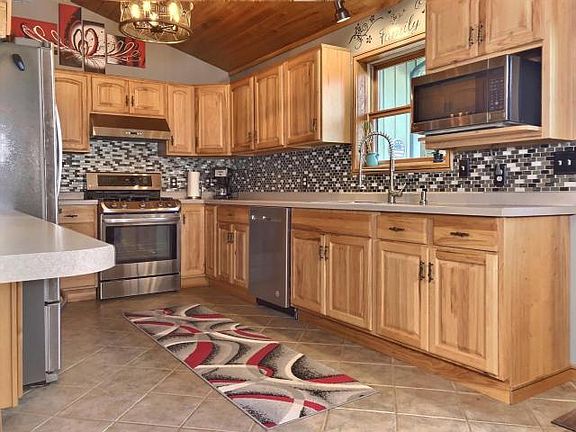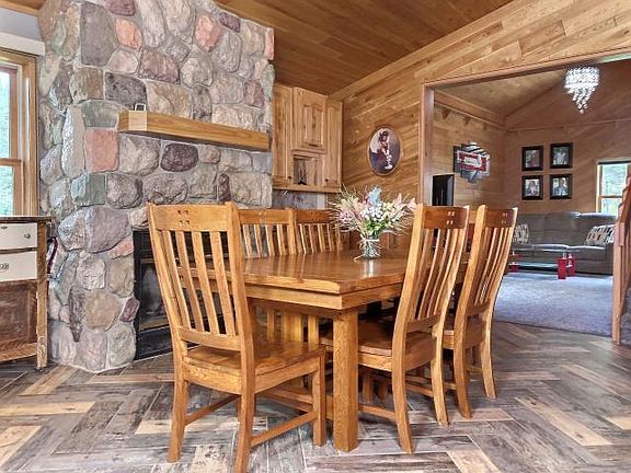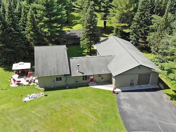 This 4BD/2BA home sits on a 6.25 acre parcel and comes with many great features. Recently updated, you'll find new flooring, as well as new appliances. To compliment the updates, hickory cabinets, tongue & groove hardwood ceiling/walls & in-floor heat add to the cozy Northwoods ambiance. You'll be hosting friends and family at the wet bar. Upstairs, you'll appreciate the seclusion of the master suite as you can relax and wind down away from the rest of the home. With a 41ft x 23ft attached garage, a 27ft x 40ft pole barn, and extra shed, you'll never run out of storage for snowmobiles, ATVs, campers, boats, etc. The three driveway entrances will help with towing and passing through the property. Enjoy a small pond, horseshoe pits, a beautiful yard with a garden and gazebo. Neighboring fields to the east make sunrises and sunsets from your patio something to behold. Make sure to watch the virtual tour video!