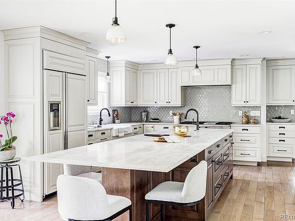 Perfectly poised in Bow Mar South, this residence is a vision of exquisite elegance. An 0.4-acre lot sprawls with mature trees and picturesque landscaping. Residents are greeted by a stunning entryway boasting vaulted ceilings and a statement staircase. The main floor features an open, thoughtfully designed layout, including a lounge area with a wet bar and a living room with a cozy fireplace. The gourmet kitchen flaunts gorgeous cabinetry, a vast center island and a farmhouse sink. Sliding glass doors open to a covered back patio complete with a built-in gas grill, firepit, fans and heaters, ensuring year-round outdoor comfort and enjoyment. A functional main-floor office is adorned with built-ins and sliding barn doors. Five gracious bedrooms include a primary suite complemented by a spa-like bath with a double vanity and a walk-in shower. Revel in outdoor relaxation in the private backyard lined with lilac bushes. A recently renovated, heated garage offers built-in storage space.