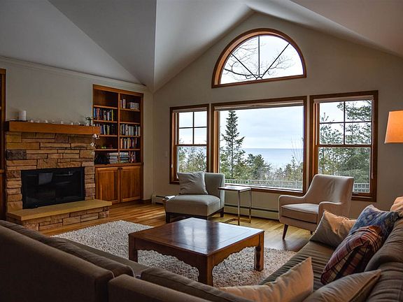 Enjoy panoramic water views and shared Lake Michigan beach access from this 4 bedroom home with 3 full /2 baths and offering main floor living. Features include vaulted ceilings, beautiful hickory flooring, main floor office with custom cherry bookshelves, gas fireplace with stone surround, and a 3-car heated garage. The spacious master suite features am en suite master bath with dual vanity's w/granite counters & tile floors, and a large walk-in closet. This well maintained home has a recently painted exterior and all new composite decking. The private setting is close to downtown Harbor Springs and near area golf and skiing.
