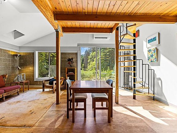 Welcome to your ultimate retreat & workspace in Scappoose! Tucked away on a private drive, this 6.52-acre property is the perfect opportunity for rural living or to escape city life and make all your dreams come true. The custom-designed and energy-efficient 2-bedroom NW Contemporary home exudes artistic charm and comes fully furnished, perfect for the home away from home. A brand-new heat pump efficiently heats and cools the space. Hang out on the main level or retreat to the lofted second bedroom to relax. Step outside & enjoy sweeping views of the property or meander down to the creek to explore. Previously owned by a well-known granite sculptor, the property boasts a detached 2500 sq ft studio that is fully equipped with a large bay featuring garage door access on two sides and soaring ceilings. Partially finished studio space with vaulted ceilings plus a fully finished office space and kitchenette complete the main level. A finished loft area above provides additional office/workspace and storage. The studio comes equipped with two pillar jib cranes, an industrial air compressor, 2 riding mowers, and so much more. An additional 576 sq ft. wood/metal shop with 220 power provides additional space for all your tools. This peaceful property is enclosed by two meadows and flanked by 2 creeks and designated forest land. Don't miss this extraordinary opportunity to own a unique rural sanctuary with everything you need to unleash your artistic visions and where creativity knows no bounds. Note: Internet access and landline service is available for the property.