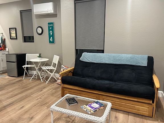 Newer Casita studio unit with One person maximum to occupy in Newer neighborhood with private entrance/full bath/stall shower/ Wood floors /Full Closet /Partially furnished with Futon/Dinette set /Flat screen Smart TV/Window shades. Clubhouse amenities/Hiking/Biking trails and off street parking is available.No Laundry Facilities on Site. Laundromat nearby.Mini Kitchen /no stove in Unit .