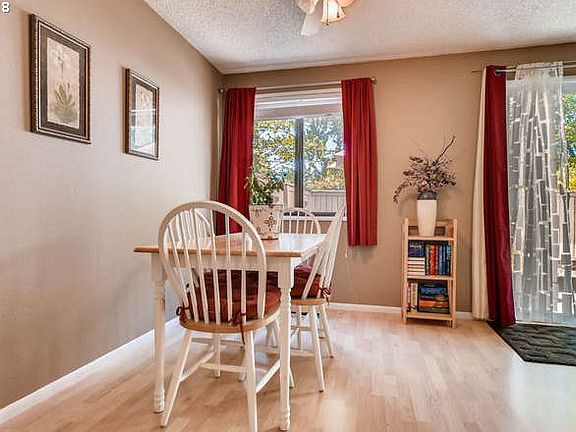 Spacious two level condo with two large bedrooms upstairs. Main level is open with a wood burning fireplace, a large half bath and laminate in living and dining rooms. Raised garden outside. Detached single car garage and deeded parking spot. Quiet community with pool, tennis courts and basketball courts. Move-in ready. No rent cap.