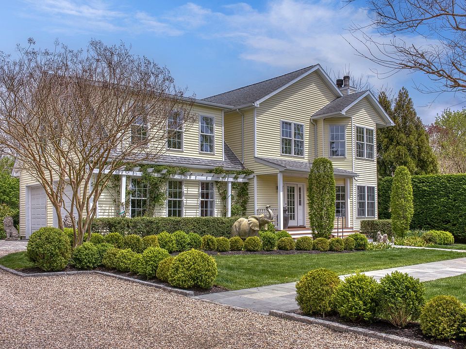 Pristine condition post modern with a vaulted ceiling entryway invites you into a Westhampton treasure. Located within a short distance to Main Street in Westhampton Beach and Dune Road beaches, this home is convenient to all. Expansive great room with fireplace includes a formal living room, dining area and den with sliders leading out to a private deck and enclosed backyard. The spacious landing on the second level leads to two en suite bedrooms, additional bedroom and bath, and finished bonus room for additional space also suitable for an office, playroom, or library. Refinished wood floors throughout. The full basement with exercise area has great possibility to finish. The two-car attached garage and beautiful front porch are surrounded by elegant and manicured grounds. Room for a pool. Move in this summer!