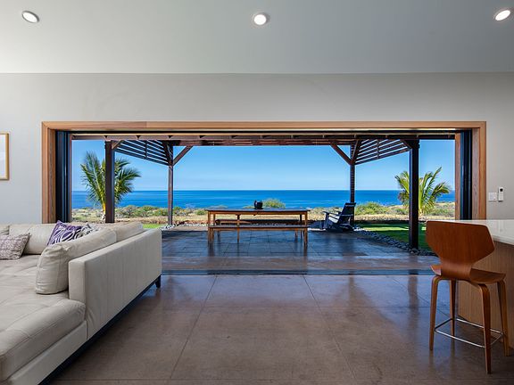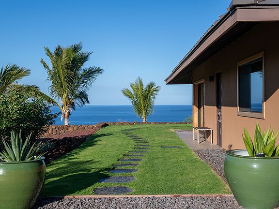 The house features polished concrete floors, stucco siding, a standing seam metal roof, vaulted ceilings, Cambria Quartz countertops, and custom bamboo cabinets and shelving. Huge Western pocket doors open to the most incredible ocean view, a large covered lanai, and a beautiful lawn. The front of the home features an open concept kitchen and bar designed for entertainment and cooking. The outdoor “island spa” in the back has a two-person soaking bathtub and an indulgent lava rock shower. The main house consists of two bedrooms, an office, and a small loft, while the 720 sq. ft. detached building is available as a master bedroom, guest house or rec room. The home is completely off-grid, featuring a photovoltaic system with a battery bank that lets you run the air-conditioning 24/7. Water is sourced from a well, treated with an automated reverse osmosis water filtration system producing 100 gallons of freshwater per hour, and stored in two holding tanks. Solar and irrigation systems are also automated and can be monitored and controlled remotely. A place of history, peacefulness, and sustainable luxury, this eco-estate is more than just a home—it’s a place of tranquility. Experience the magic of North Kohala’s coastline, where history, culture, and nature come together in perfect harmony.