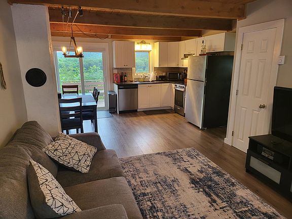 Beautifully remodeled condo with new floors, new stainless appliances. 1st floor master br/bath suite and another bath with granite countertops, tile shower and flooring, both baths all redone, 1st floor washer and dryer. 2 Br + loft. Great View to NH White Mts towards Franconia Notch and enjoy walking trail to Pemi River below. Convenient location between Loon, Cannon Mts and Waterville Valley with NH White Mt forests nearby and a short drive to lakes region. Rentals over 6m allowed only.