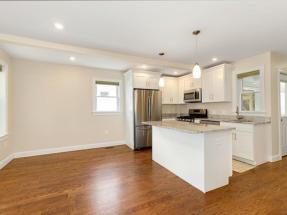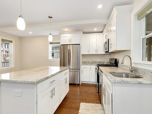 Renovated bi-level condo with modern updates in a charming New England style home just a half block from Magnolia Park! Gut renovated in 2015, this home greets you with a wide open floor plan, abundant natural light, and hardwood floors throughout. The living room has large windows and is completely open to the dining room and stunning kitchen with granite counters and island, stainless steel appliances, and custom cabinets. Three bedrooms with ample closets and an adjacent full bathroom complete the main level. On the lower level is a huge open family room, laundry, a full bathroom, and storage. Enjoy outdoor living on the wraparound porch. One dedicated off street parking spot included. In a great location on the edge of Arlington and Cambridge very close to the Red Line Alewife station via the Minuteman bike path. Move right into this incredible like new home!