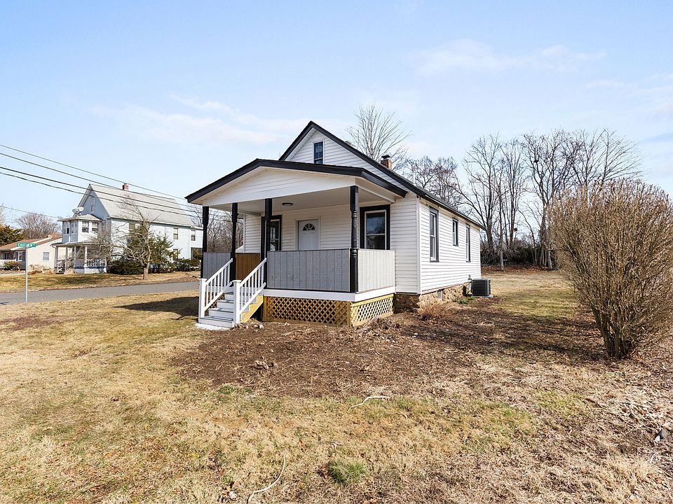 One-floor living at its best! This beautifully renovated home features all upgrades completed, including a new roof, central air, furnace, maintenance-free vinyl siding, two porches with composite decking and light fixtures. Inside, you'll find a new kitchen with white cabinets, granite countertops, a breakfast area, and stylish backsplash. Stainless steel appliances complement the look. The kitchen flows into the living room and two spacious bedrooms, one with a walk-in closet, and a modern bathroom with a sliding glass door. Energy-efficient thermopane windows will help save on heating bills. Enjoy gleaming hardwood floors, neutral paint colors, a level yard perfect for outdoor gatherings, a storage shed, and patio area with string lighting. Conveniently located near highways, shopping, and restaurants. Move-in ready with nothing left to do!.