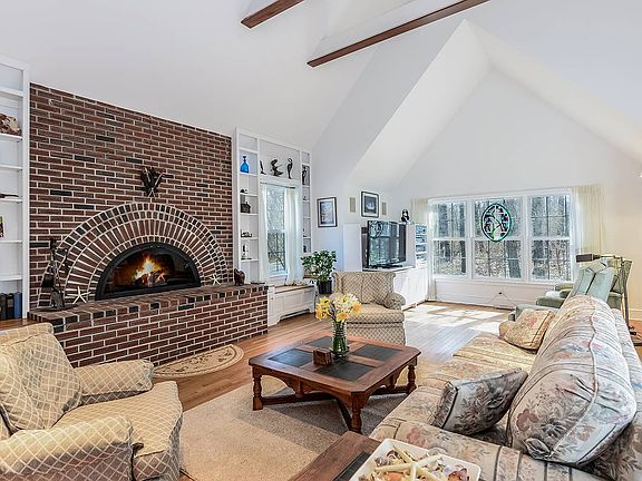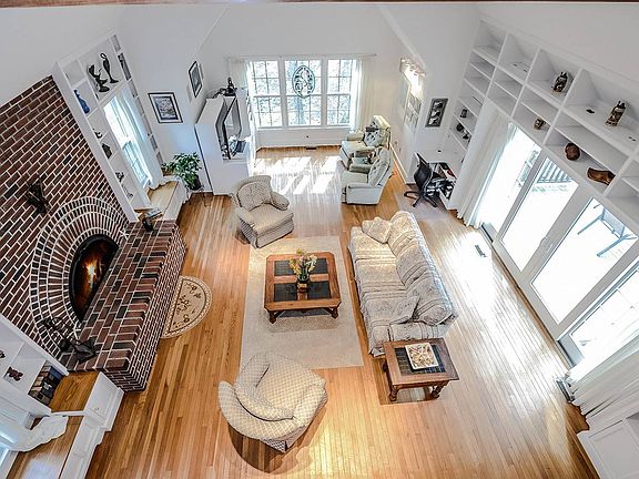 The house is on 1.56 acres abutting conservation with always changing colors and wildlife. You will fall in love with this home the minute you walk in viewing the magnificent step-down living room with soaring ceilings, extensive built-ins, tall hearth floor to the ceiling fireplace. Gorgeous hardwood floors throughout, first floor master and laundry, spacious kitchen with more built-ins, spacious kitchen island with gas stovetop, large pantry and access to the garage. Home has central air, alarm system, recessed lighting, two car garage, and Natural gas to the home. The second floor has another ensuite BR with two other spacious BRs and loft area (office, sewing area, reading) overlooking the grand living room. Bonus is the third level attic which is a huge three sets of windows for plenty of light that can be finished off as more living space for the family. Home has a large deck and three season porch off the dining room. Privacy, peace, harmony will be your experience here.