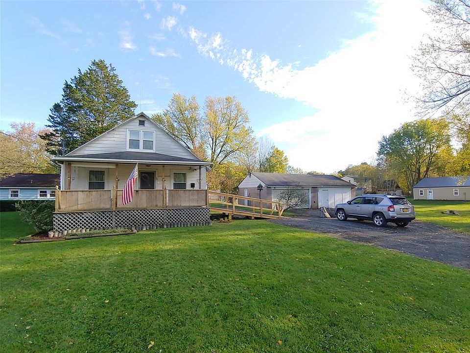 Spacious Cape Cod home on large double lot greets you with a 13x21ft front deck. Open floor plan downstairs features living room and dining room/play room with gas fireplace, eat-in kitchen, full bath, and bedroom/office. Utility room at back with a huge pantry and indoor workbench lead out to a fenced-in back yard with gazebo and pond. Upstairs has 2 bedrooms and plenty of attic storage area. Recent updates include double-paned windows, fresh paint throughout, stove/oven, water heater, and W/D. Property includes oversized detached 2-car garage with equal sized workshop totaling 38x44 ft. and 20x12 freestanding shed with locking storeroom.