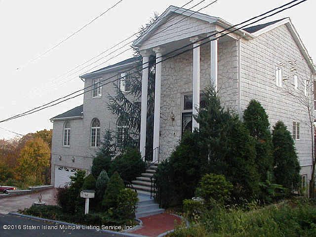 Huge contemporary castle with panoramic city/bridge views. House has 5 floors (2,000 sq/ft each), 8 bedrooms, 8 bathrooms, master suite with jacuzzi and 2 walk-in closets. Romantic family room and 2 fireplace. House has hospitality suite with 5 bedrooms and 2 bathrooms, multi zones for AC and heat, 3 heating units and 3 AC units. New siding, 3 car garage. Huge 6ft deep pool in excellent condition. Best spot in Grymes Hill with super privacy. House needs some attention and updating.