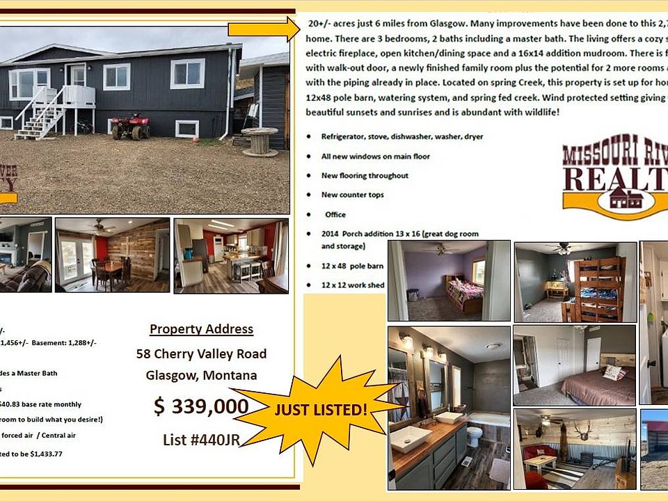 Listing #440JR 20+/- acres just 6 miles from Glasgow. Many improvements have been done to this 2,744+/- sq. ft home. There are 3 bedrooms, 2 baths including a master bath. The living offers a cozy setting with an electric fireplace, open kitchen/dining space and a 16x14 addition mudroom. There is full a basement with walk-out door, a newly finished family room plus the potential for 2 more rooms and a bathroom with the piping already in place. Located on spring Creek, this property is set up for horses with a 12x48 pole barn, watering system, and spring fed creek. Wind protected setting giving you the most beautiful sunsets and sunrises and is abundant with wildlife! So much more! A must see!
