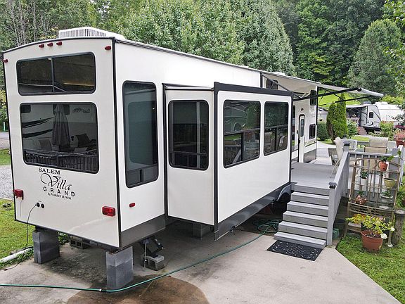 Forest River 2019 Villa Grand (Salem), w/ 3 slides. Like Brand New. Floorplan w/ generous BR PLUS 2 sleeping Lofts. Fully furnished, everything included except personal items. Electric fplc in great room. Dark out shades. Full sized shower in bath. Dbl sinks in kitchen, stainless refr, work island. pantry. Included with this home is Lot 84 in Arrowhead Valley RV Park. Year-round living is allowed. Composite decking offers excellent outdoor living space. HUGE concrete pad with DRIVE THROUGH lot. Parking for 5 cars. Dry Shed for extra storage. Park offers INGROUND swimming Pool, Club/pavillion w/ Fireplace, Laundry house. Excellent location to Lake Nottely and Boat Ramps, TVA Poteete Creek Beach. Wonderful Package for affordable Living. $570/year covers Sewer, Wifi, Grounds maintenance, garbage pickup and common areas.