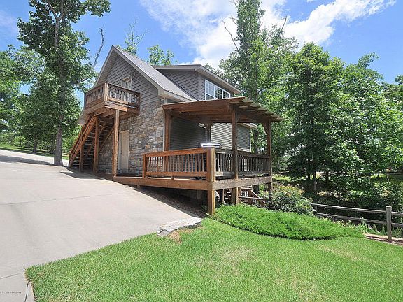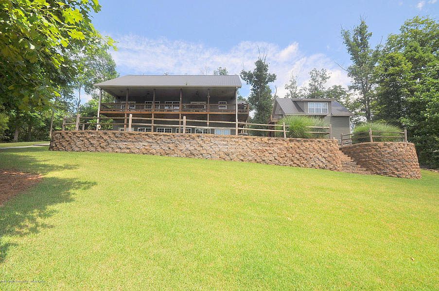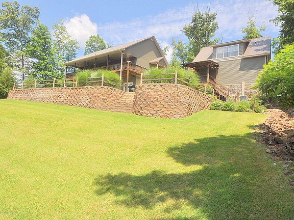 Custom built lakeside home with solid rock shoreline as well as a separate sand beach overlooking massive and captivating rock cliffs and wooded mountainside of the Bankhead National Forest. 2 story, 4 BR, 3 BA main house with finished basement that includes a fully equipped second kitchen on first floor in addition to main kitchen on main floor. Detached 2 car garage with guesthouse above that includes a 3rd full kitchen, a full bath, bedroom (sleeps 2), 2nd sleeping cove (sleeps 2) and living area.