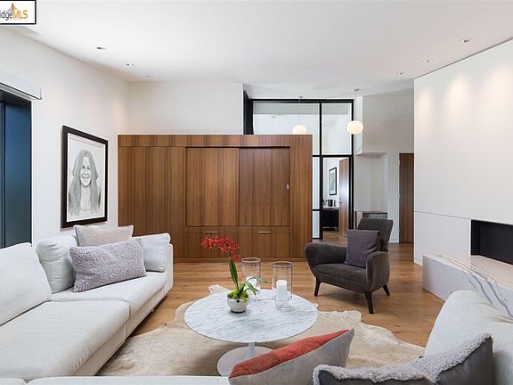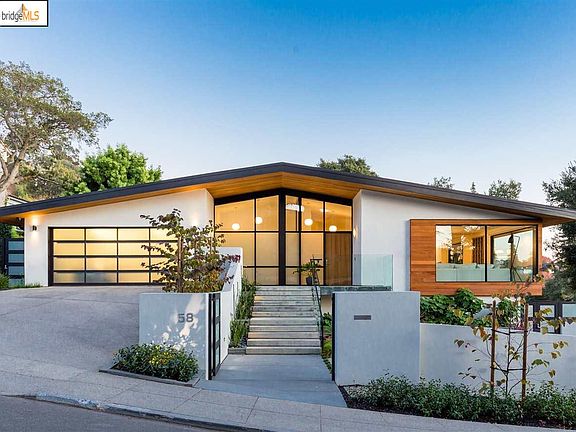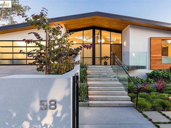 58 Crest road is a 4+ bedroom, 4.5 bath Mid Century Modern that has been meticulously reimagined by acclaimed architect, Phred Starkweather. Stately yet unassuming from the street and gated for privacy, enter to chic open spaces, wide plank oak flooring and walls of glass that frame stunning views of San Francisco Bay like works of art. This mostly level residence is sure to captivate the most discriminating buyers looking for a lifestyle home that feels like a luxury spa destination for entertaining and relaxation. Every detail has been considered during the extensive remodel. The gourmet kitchen leaves nothing to be desired and features Viking and GE appliances, a walk-in pantry, large waterfall island and plenty of counter space. The adjacent dining room allows for intimate family gatherings while the open space and floating cabinetry allows for larger scale entertaining. Note the custom 3 sided fireplace and how it anchors the space between the living room.