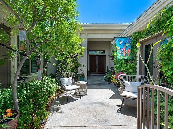 Welcome to your dream home nestled in prestigious Belmonte Estates that far exceeds other homes in the community. Corner lot with expansive mountain views, privacy hedges, well-manicured landscape, large pool and spa, and mature citrus trees. Located on a generous quarter-acre lot, featuring a meticulously designed layout with 4 bedrooms (including a separate casita), an office, a laundry room, and 3.5 baths. The Renewal by Anderson double pane windows and French doors ensures a tranquil, temperature-controlled environment. Entertain in style with the expansive living and dining areas, where high ceilings and large windows invite natural light and views of the lush backyard. The chef's kitchen, with its granite countertops, GE Profile appliances, and ample storage, opens to a cozy family room featuring a corner gas fireplace and built-in entertainment center. The primary suite is a haven of relaxation, with a walk-in closet, ensuite bathroom boasting dual sinks, a large walk-in shower, and direct access to the backyard oasis. Here, a Pebble Tec saltwater pool & spa, built-in gas BBQ, and covered patios with ceiling fans and misters create the perfect setting for entertaining or serene evenings under the stars. Additional luxuries include a three-car garage with custom flooring and storage, an Onkyo audio video control tuner amplifier with a speaker system, a built-in floor safe, fully landscaped front yard and gated courtyard that sets the tone for this exquisite property.