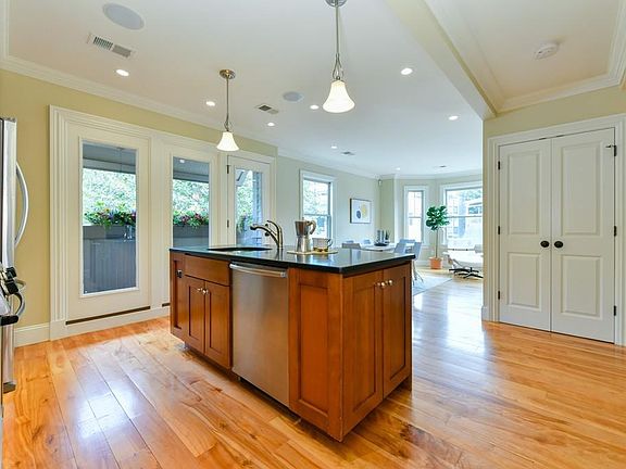 Top floor modern 2+ bed, 2 bath in prime JP location mins to Centre St or Pond. Corner unit flooded with light + designer finishes. Open floor plan with birch cabinetry, honed counters & kitchen island w/ Bosch appliances, perfectly positioned to interact with guests in bright dining / living space. Lovely kitchen balcony ideal for gardening or morning coffee, or take the steps up to your private roof deck offering gas line for grilling, and water line for gardening. Main bedroom suite offers large marble bath and stand-up shower. Bonus room ideal for nursery or home office. Enjoy high ceilings, unique birch flooring, in-unit laundry, audio system, upgraded closets, built-in bookcases. Private basement storage room + side basement door for easy access to bikes etc. Live in style in the heart of JP. Shown by appt.