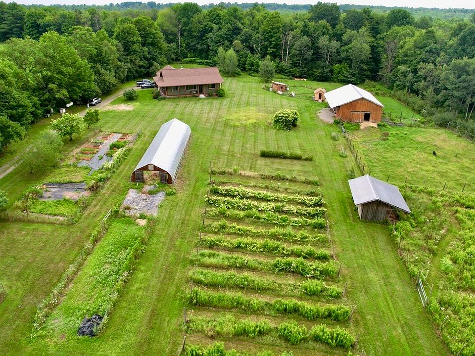 Imagine waking up to the gentle sounds of nature and relaxing at sunset on the wrap-around porch, taking in the tranquil views of your expansive 9-acre homestead! This home is loaded with character and amenities including new heat pumps and an automated generator backup system for both the home and the barn! The open-concept design with dramatic 10-foot ceiling peaking at about 18 feet creates an inviting atmosphere with the wood stove and brick hearth. The primary ensuite is a luxurious retreat set off from the rest of the home with a custom tile shower, double vanities, a walk-in closet, dressing room, and access to the private back deck. The rustic post & beam barn is a versatile space with radiant heat in the epoxy floors. Inside the barn is a commercial kitchen with year-round water, a Rec Room and storage. This section of the finished barn serves as an overflow space for large gatherings or events when not being utilized in day-to-day operations, adding to the property's functionality. The gable ends of the barn have housed goats, alpaca, sheep ... other outbuildings have served larger animals as well as chickens and rabbits. Located on a dead-end road just three miles from the highway, this home offers the perfect balance of rural serenity and convenient access to Newport, Waterville, and Skowhegan, making it ideal for those seeking a quiet retreat without sacrificing the convenience of restaurants and shopping. Don't miss out on your opportunity to make this exceptional property your new home!