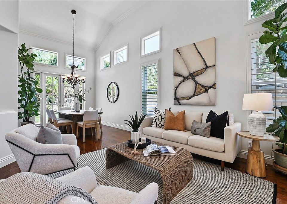 Upon entry the Upgrades, Warmth and On-Trend Designs are immediately noticed with Stunning Hardwood Floors, Crown Molding, Soaring Two-Story Cathedral Ceilings and an Illuminating Skylight allowing for an abundance of Natural Light to flood the home. The Spacious Great Room features Pristine French Doors that open up to the Lush Landscaped Backyard Oasis.