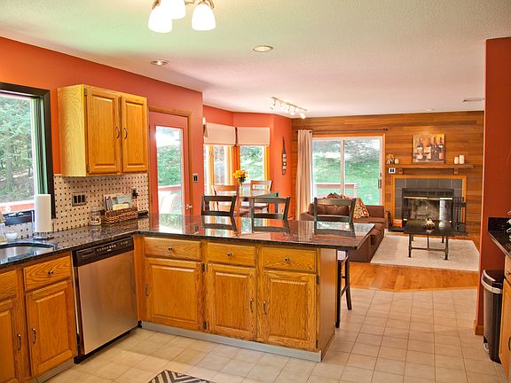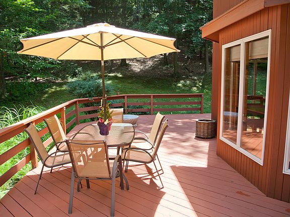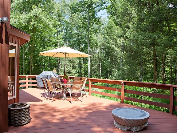 Lush natural landscaped views are yours from every window in this amazing home! Soaring ceilings, skylights, gleaming hardwood floors, updated kitchen w/ custom back splash, granite and stainless. There are spacious rooms, a light and bright interior, and finished walkout lower level adds 675 square feet of living space. Come home from a hard day, relax on the 14'x31' deck and listen to the quiet. Simply perfect!