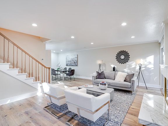 This stunning 2 bedroom luxury townhome boasts a contemporary and expansive floor plan in the private and tree lined community of Los Altos Square. Upon entering, you are greeted by a spacious and comfortable gathering space, abundant with natural light flowing from the dual sliding doors that lead to a private patio that wraps around the front and sides of this corner unit townhome. Soothing hardwood floors extend throughout the main level through to the dining room. The gourmet chef's kitchen that marries form and function with elegant quartz countertops, gorgeous tile backsplash, and stainless steel appliances. Upstairs are 2 large suited bedrooms with dual vanity, generous mirrored closets, that opens to a private balcony. Spacious 2-car detached garage located steps away from the home. Well maintained HOA with 3 pools and clubhouse. Children may attend the coveted Almond Elementary, Egan Junior High, and Los Altos High (buyer to verify).