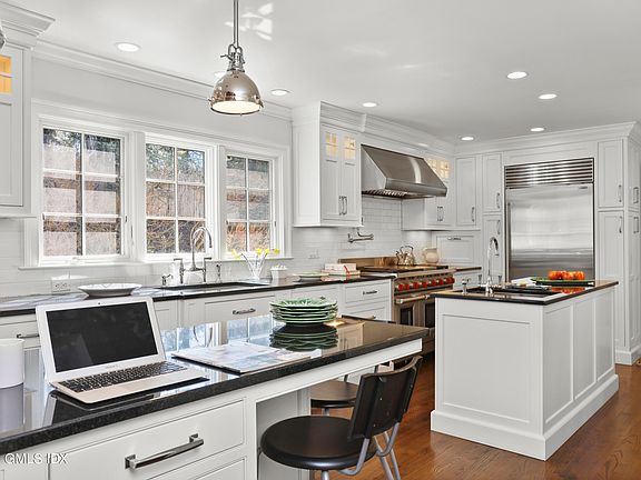 New to Market! Gracious 5 bedroom beautifully renovated Mid-country Colonial on 2+ landscaped acres with great vistas. Featured in CT Cottages & Gardens Magazine & located on a private lane this stunning home has a state-of-the-art custom kitchen with Sub-Zero & Wolf appliances. On the main floor is a generous foyer, spacious family room with vaulted ceiling & floor to ceiling brick walled fireplace, dining room, living room w/fireplace, paneled library & 3 exposure solarium. Upstairs via a lovely curved staircase are 4 bedrooms including the master suite with multi-closets & bath with double sinks. Walkout garden level has a bedroom, bath, playroom/exercise room, office & storage. Outside is a huge terrace with stone sitting walls. Great yard for play & gardening. Close to town & schools.