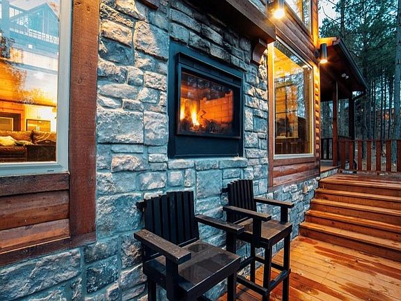 Hillside Treehouse stands as a testament to unparalleled luxury and refined living. As you approach this magnificent cabin, a grand staircase welcomes you, showcasing exquisite craftsmanship and leading to the splendor that awaits within. Set against the backdrop of a serene cul-de-sac, this cabin epitomizes exclusivity and charm. Upon crossing the threshold, you are enveloped by an atmosphere of sophistication and warmth, courtesy of the open-concept floorplan designed to elevate every moment of entertainment and relaxation. The cathedral ceilings of the living room accentuate the grandeur within, while picturesque windows frame breathtaking views, seamlessly merging the outdoors with the interior. The kitchen, boasting white custom cabinetry, granite countertops, and stainless steel appliances marry functionality with elegance. A feature this cabin has is a coffee bar, while the rustic brick backsplash exudes timeless allure. The spacious laundry room has cabinets above and in between the washer and dryer, ensuring seamless organization. The bedrooms, thoughtfully positioned for privacy, are spacious, each with their own en suite bathrooms. Venturing upstairs reveals a haven of entertainment, with a cozy seating area and a game room featuring a retro tabletop arcade, foosball table, and a shuffleboard table, offering endless hours of fun. The bunk rooms provide an enchanting escape, with multi-level bunk beds ensuring a restful slumber. Across the game room you will find another bedroom that has its own private access to an upper deck. Stepping outside onto the expansive back deck, a symphony of relaxation awaits, with another fireplace and a hot tub inviting you to unwind. An outdoor eating area, bench swing, cornhole boards are also available for your enjoyment. The fire pit and playscape in the backyard offer endless opportunities for recreation. Welcome home to the epitome of refined living, where tranquility meets sophistication in perfect harmony.