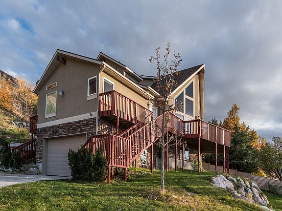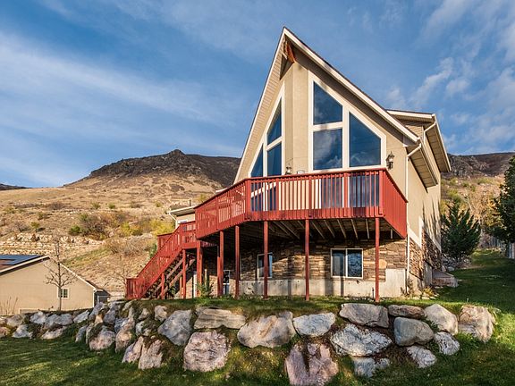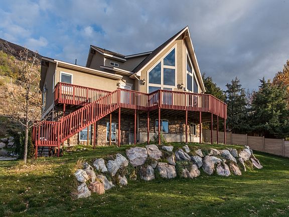 A MUST SEE! Spectacular Panoramic views surround this lovely mountainside hideaway! Conveniently located in an east side cul-de-sac with a private driveway to an oversized garage! The main floor is enhanced with spacious vaulted ceilings and views in every direction from the large cathedral windows. The open concept master bedroom has a jetted tub, separate shower, walk in closet, and must-see views! The spacious kitchen & dining concept has all stainless steel appliances, separate pantry, and a walkout deck with a bridge to the upper grass of the property. The basement boasts a garage floor entry, second kitchen, large family room (or large bedroom - possible rental), as well as another bedroom (or can be used as a hair salon, massage room, or bedroom). The outside includes a private entrance to the walking path, hundreds of plants and herbs, a large firepit (with VIEWS!), and plenty of place to feel secluded. Call for your appointment today! Buyer to verify all.