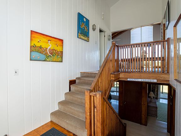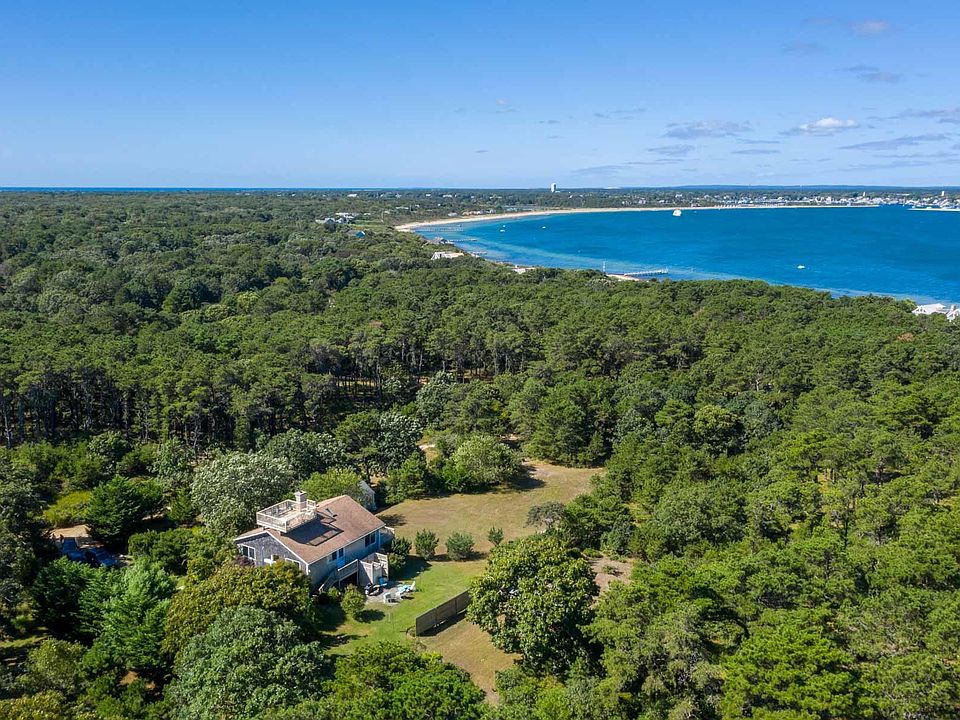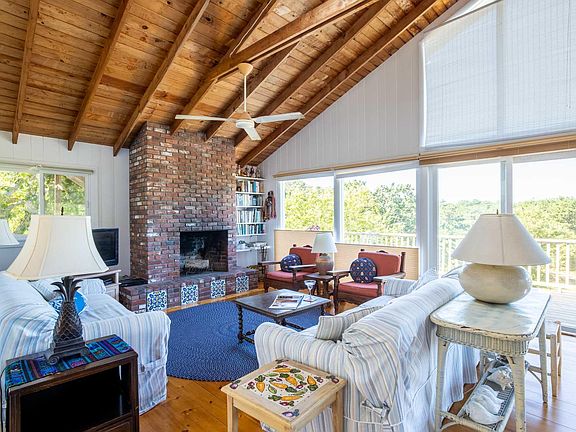 As good as waterfront. This property abuts a waterfront Land Bank property and is less than 700 ft down a private deeded path to a sandy open water beach on Nantucket Sound where you can enjoy calm, swimmable waters, fishing, and access to your boat. The home's large windows provide wonderful light and views in every direction. It is a reverse floor plan home with spacious living/dining room with vaulted ceiling and a large separate kitchen. The bright sunny kitchen overlooks the dining area on one side and the mature Japanese Maples on the other. There is a queen bedroom and bath upstairs, and a king bedroom plus two twin bedrooms and bath downstairs. There is a large outdoor shower and decks on three levels. The upper deck offers views of the water and The sailboat races in the outer harbor. End the day watching the sun set over Edgartown harbor followed by star gazing into the night. On July 4th you will have an unobstructed view of the fireworks display in the harbor. East Beach, the best ocean beach on Chappy, is only 5 minutes by car. Just ½ mile from the house is the renowned Royal & Ancient Chappaquiddick Links golf course and a popular fishing beach known as the ''Gut''.
