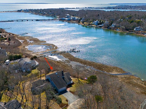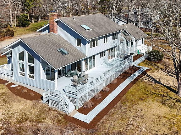 Discover the epitome of waterfront living at 58 Partridge Lane, East Falmouth, located at the end of a quiet cul-de-sac on Green Pond. This contemporary sanctuary offers 2,923 sq. ft. of impeccably maintained space. Enjoy breathtaking views of Green Pond to Martha's Vineyard and picturesque sunsets from nearly every room, thanks to expansive west-facing windows and two decks overlooking the pond. The updated kitchen, wet bar, two-sided fireplace, and cathedral ceilings add to the home's allure. The first-floor en-suite primary bedroom includes a private office/den, perfect for tranquility and productivity. The second-floor en suite primary bedroom, which could serve as a family suite, features a bonus sitting area/office for added guest comfort and versatility. Venture outdoors to kayak directly from your yard to Green Pond Marina or the beach, and entertain on the spacious deck. Nestled on a .729-acre lot, this property promises peace, privacy, and proximity to the beach, making it a haven for discerning buyers.