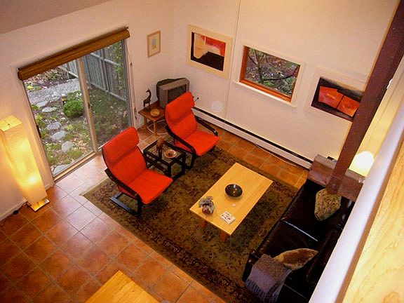 Just 5 miles to Woodstock, N.Y./Saugerties, N.Y. and situated on 7 very private acres with private 14 are lake and glorious mountain views. Secluded but easily accessible, peaceful, quiet and beautifully landscaped. Every one who has stayed here, finds it to be a paradise and much more than the photos can show. The 1000sf duplex is clean and tastefully furnished. As you enter your own private entrance into the great room, with 20' ceiling you will find a very comfortable spacious seating area looking out to an intimate Japanese Garden. There is a separate dining area, and fully equipped kitchen. Upstairs is a large bedroom, overlooking the living area, with a queen size bed and stocked with fine linens. The second bedroom has a double bed and large skylight and a contemporary tiled, skylit bathroom with luxurious Egyptian cotton towels. The duplex is attached to a large H shaped house, owned and built by the artist in residence and the duplex is quite separate from owners residence and always updated for decades now. The setting is truly serene and park like. Pool to lounge beside or two different screened in areas to sit. Take the canoe out on the lake and experience its beauty. Sit on the Adirondack chairs lake side and just chill. If you every feel like leaving the property, you'll find the local villages of Woodstock and Saugerties to be very special. Lots of small shops to browse thru, incredible restaurants to try out. The Fall colors here will blow your mind. This is truly a four season get away and this property is very special, with decades of work to show for it. You will also get to meet my German Shepherd, Max and my Siamese cat, Kiko! The duplex is available by the weekend (2 night min,), week, month(s). Price depends on Season and length of time. This is a none smoking, partying house! includes all utilities