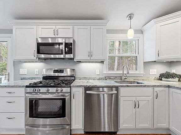 Fabulous curb appeal plus incredible interior updates (over $100K in recent improvements) create the perfect place to call home. Beautiful exterior has many high end details: paver walkway, granite stoop, new retaining wall and driveway, Reeds Ferry shed with electricity. The gorgeous interior offers a fully renovated kitchen with vaulted ceiling open to the dining and living area. Highlights include bright white cabinets and a separate pantry closet for plenty of storage, stainless appliances, granite, stylish pendant lights and a huge wrap around island with seating for five! Gleaming hardwood floors throughout the main floor living area and bedrooms. All three bathrooms, including the en suite, are updated. Family room and office have brand new carpeting and the playroom offers a ceramic tile floor. With an automatic generator, Harvey windows, younger roof (2015) and boiler (2013), there is nothing to do but move in!