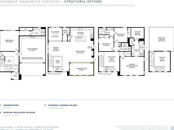 The stylish Vermont Elite opens with a soaring foyer and stairs leading to the open-concept main living level. The elegant great room is central to a bright, casual dining area and a well-equipped kitchen with wraparound counters and cabinets and a center island with a breakfast bar. Dine al fresco or relax on the covered balcony. The third floor reveals a soaring two-story loft and two secondary bedrooms that share a full bath with a separate dual-sink vanity area. The beautiful primary bedroom is enhanced by a walk-in closet and a spa-like bath with a luxurious shower, a dual-sink vanity, and a private water closet. Additional highlights include a two-story loft for added living space and a laundry room conveniently located on the bedroom level. The fourth floor is home to a chic rooftop terrace ideal for entertaining. Other desirable features include a secluded secondary bedroom and full bath on the first floor, a powder room on the second floor, a versatile flex room, and convenient bedroom-level laundry. Disclaimer: Photos are images only and should not be relied upon to confirm applicable features.
